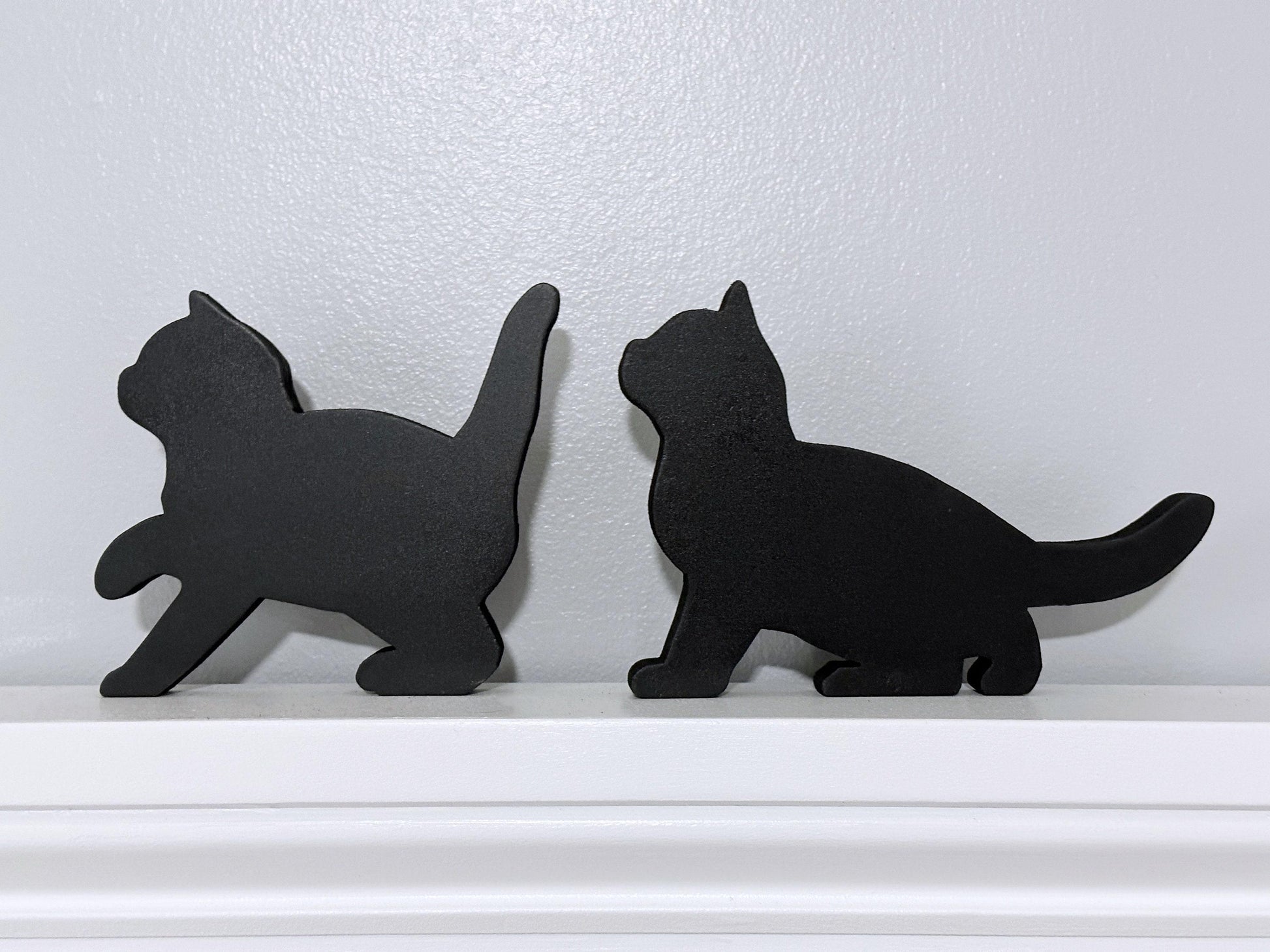My black cat door topper kittens can also be used as shelf sitters for a unique touch with a dash of cuteness. These handcrafted feline figures are made from 1/2" wood and stand independently, eliminating the need for wall attachments and potential nail holes. They are finished on both sides, giving you the option to display them facing either direction. However, please keep in mind that these are not toys and are not suitable for outdoor use. Each kitten measures approximately 4-6" in length and stands at a height of 4". This listing is for a set of two kittens, making it a purrfect gift for any cat lover. Elevate your home decor and bring a touch of minimalistic kitty art with these adorable black kittens.