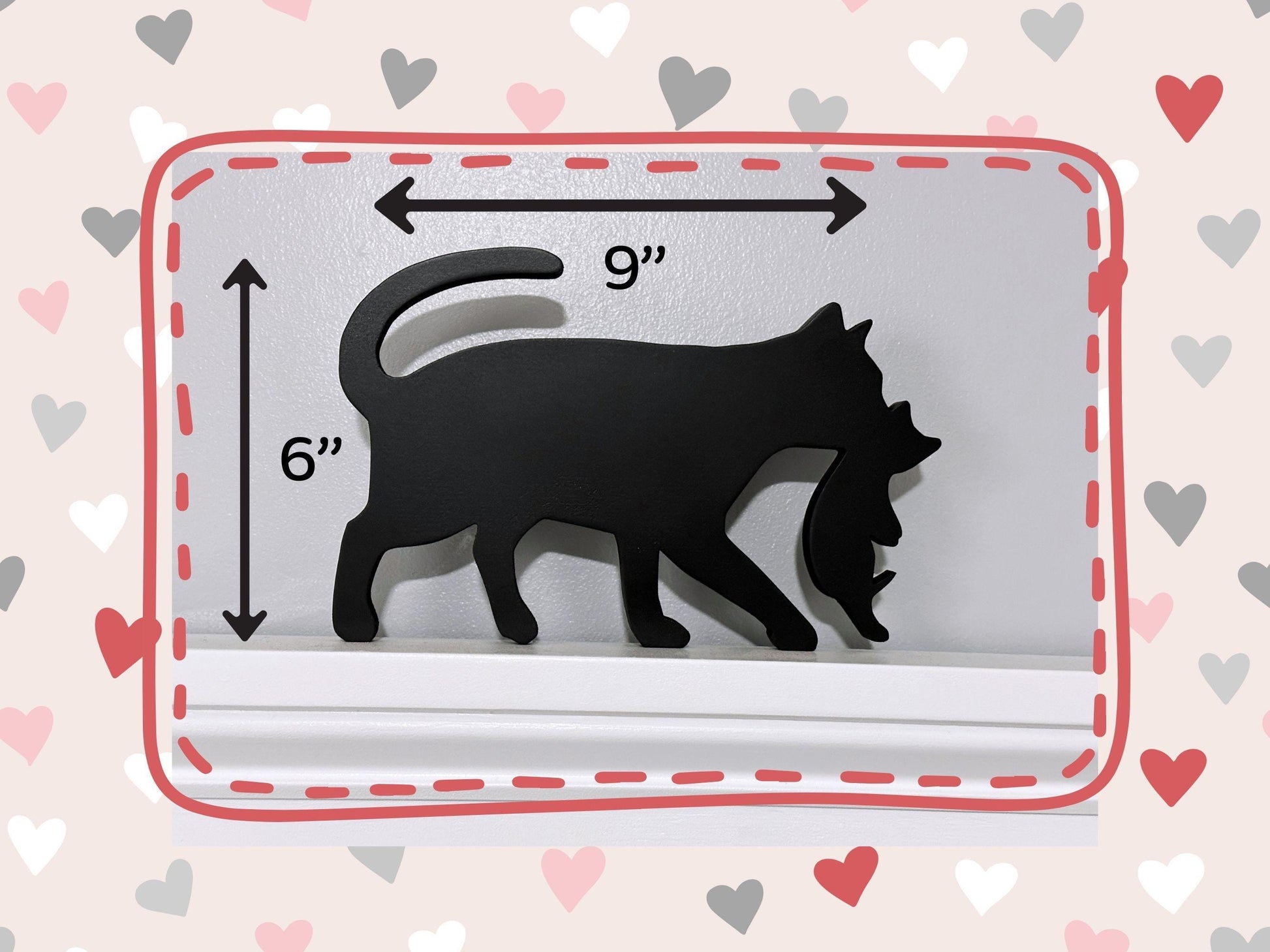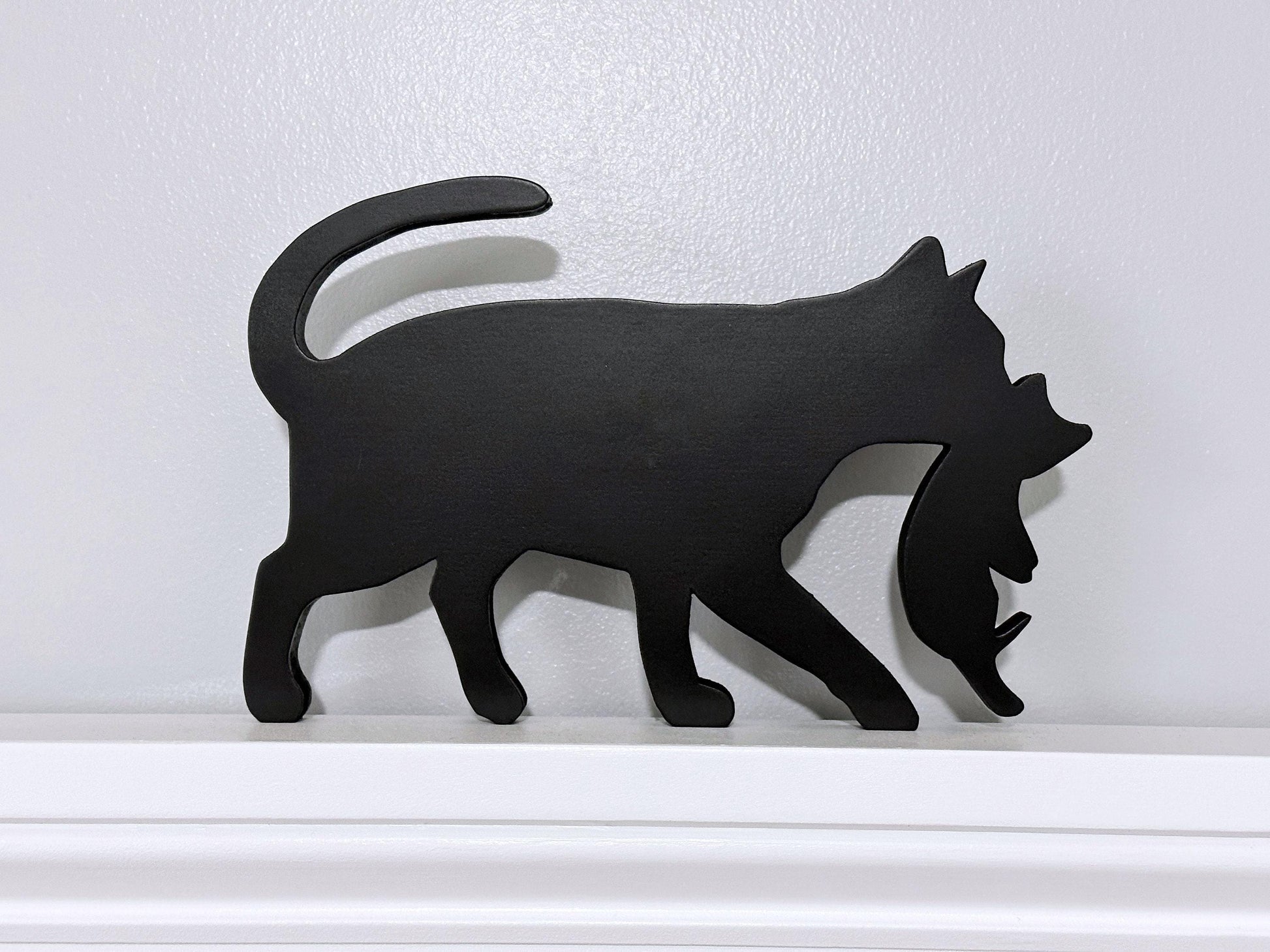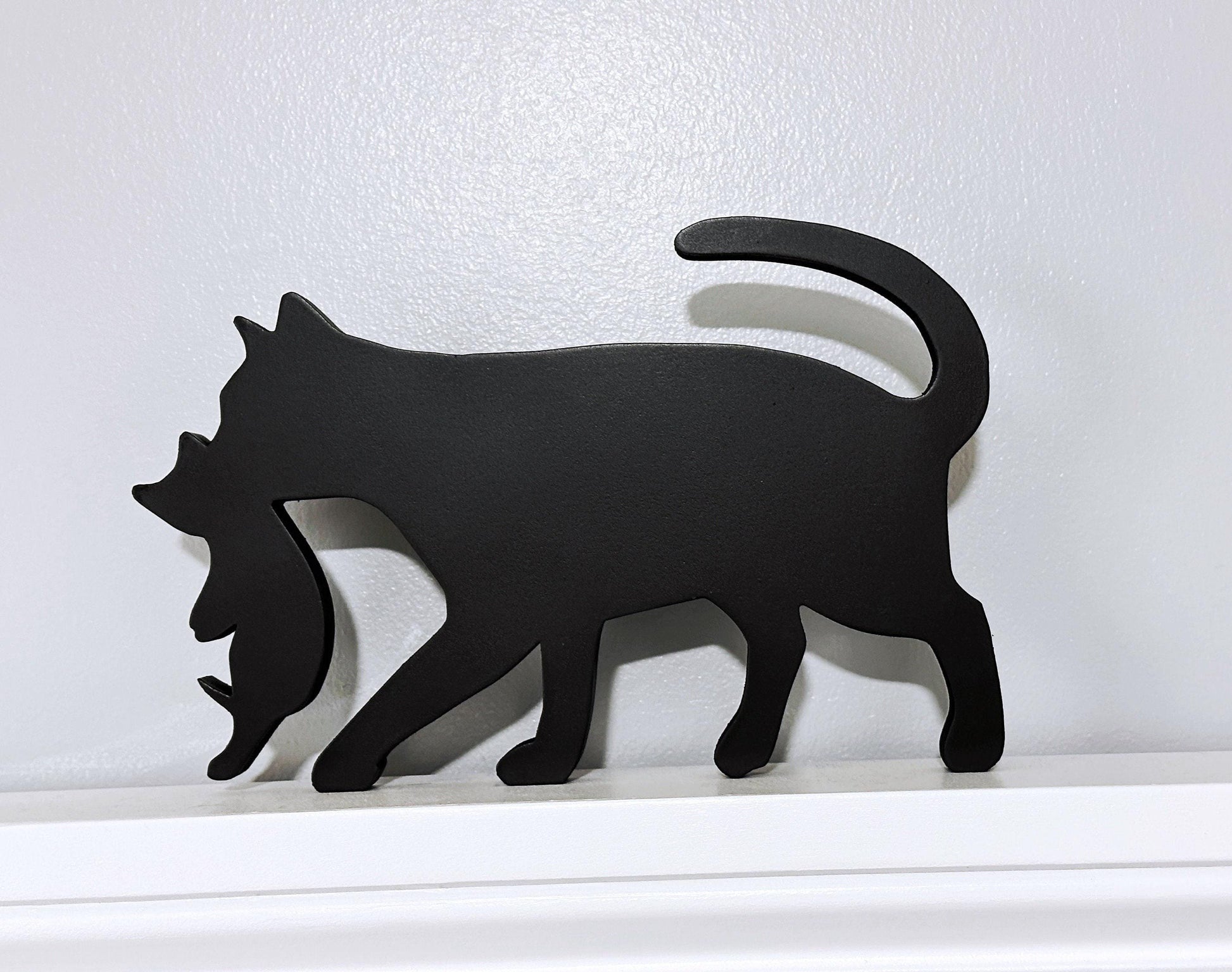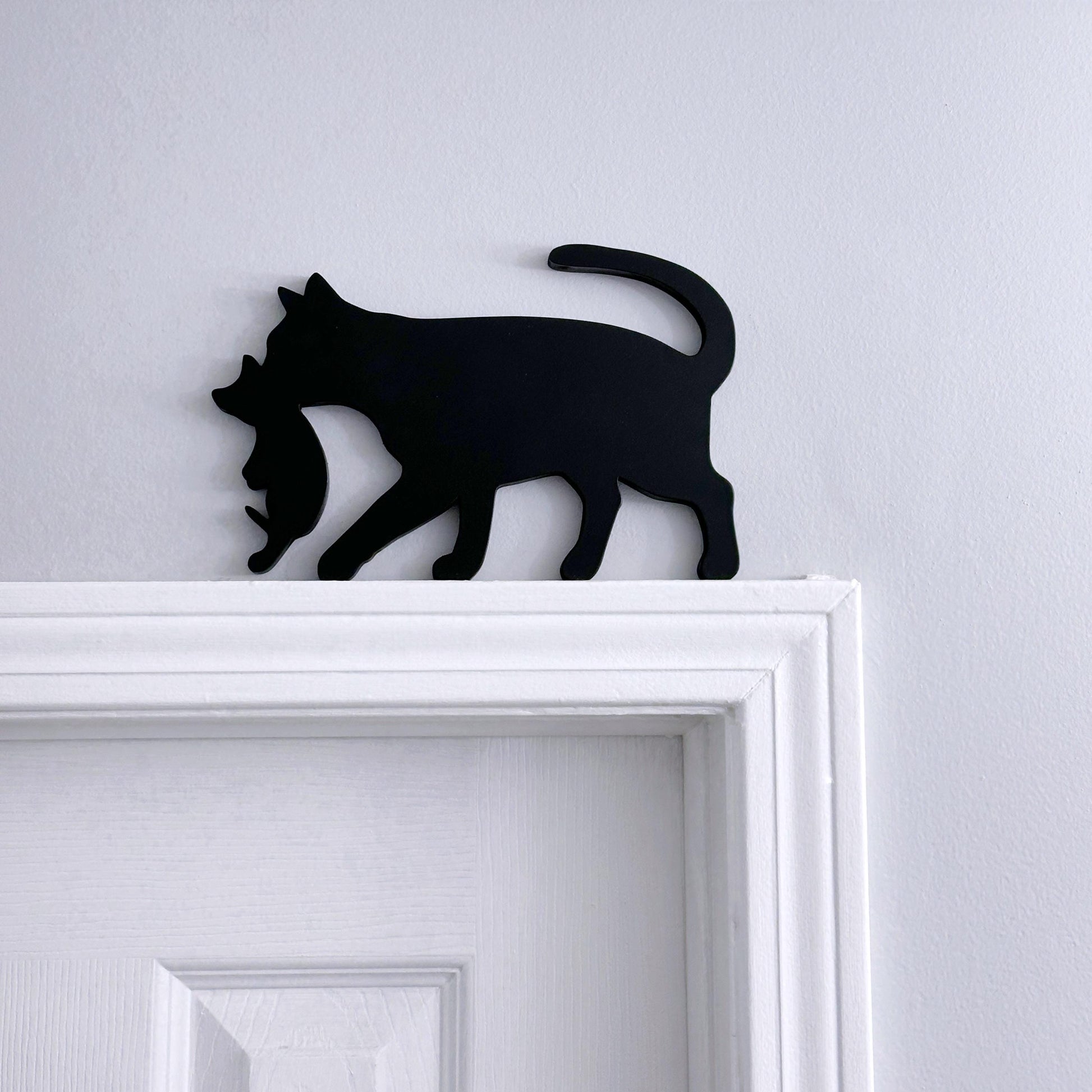 My black cat carrying kitten door topper is also perfect for sitting on a shelf in your office or any room in your home. It's an ideal gift for any cat lover in your life. Measuring approximately 9” in length and 6” tall, this cat door topper is the perfect size to stand on its own or fit over a door frame. Made from 1/2” thick wood, it is sturdy and durable. Painted in a sleek black color and sealed for protection, this cat topper is not suitable for outdoor use. What makes this cat door topper even more unique is that it is finished on both sides, allowing you to display the cat facing either left or right. Bring a touch of whimsy and playfulness to your home with this minimalist yet charming cat art.