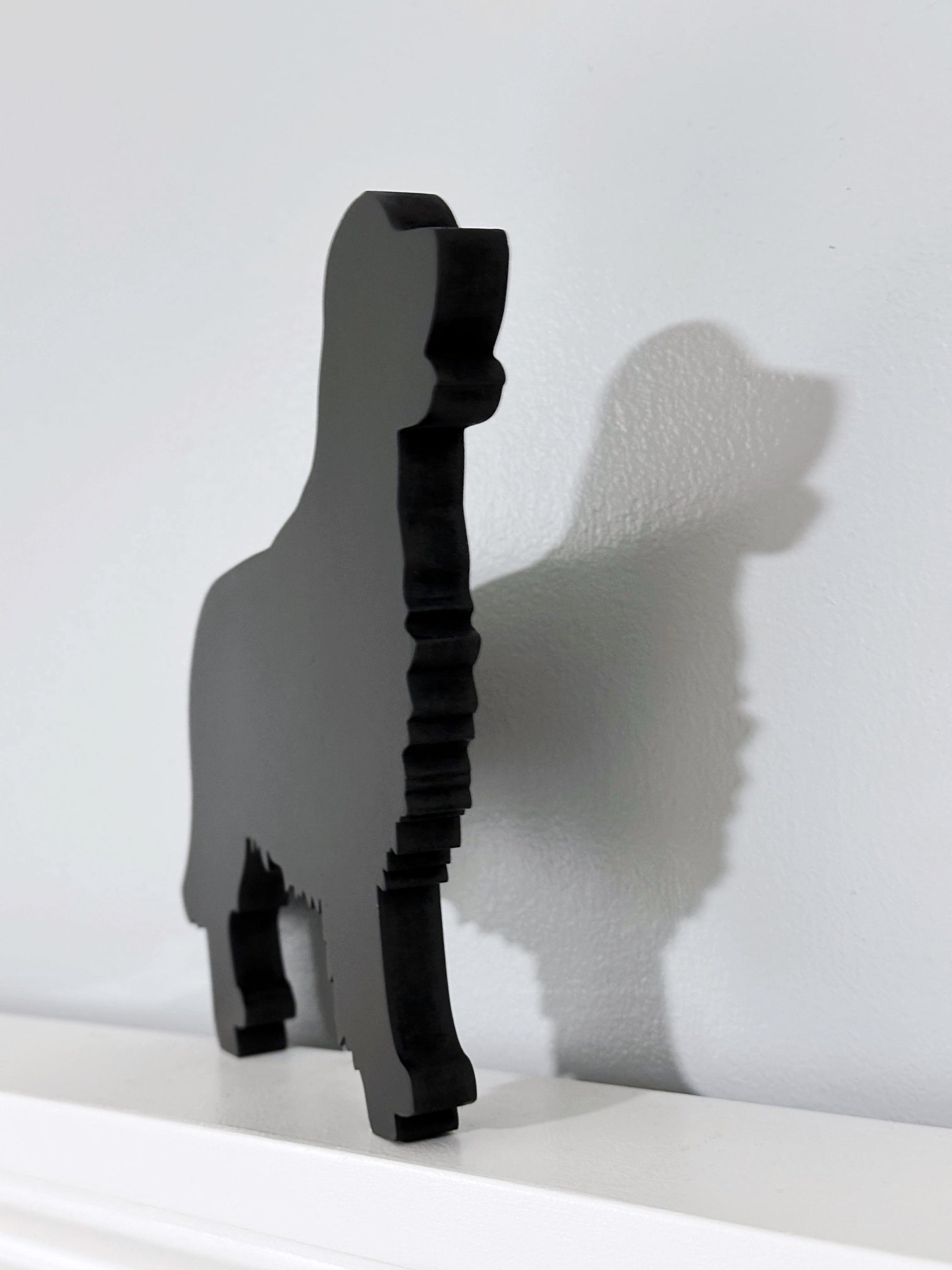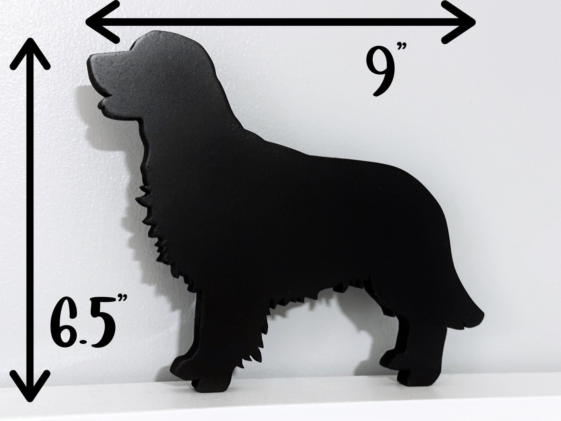 This Golden Retriever dog is hand scrolled from 1/2” wood and can rest on top of your door frame. It measures approximately 6 1/2” high and 9” wide.