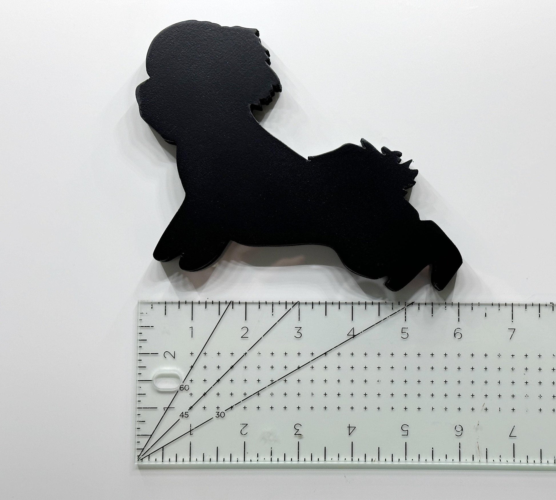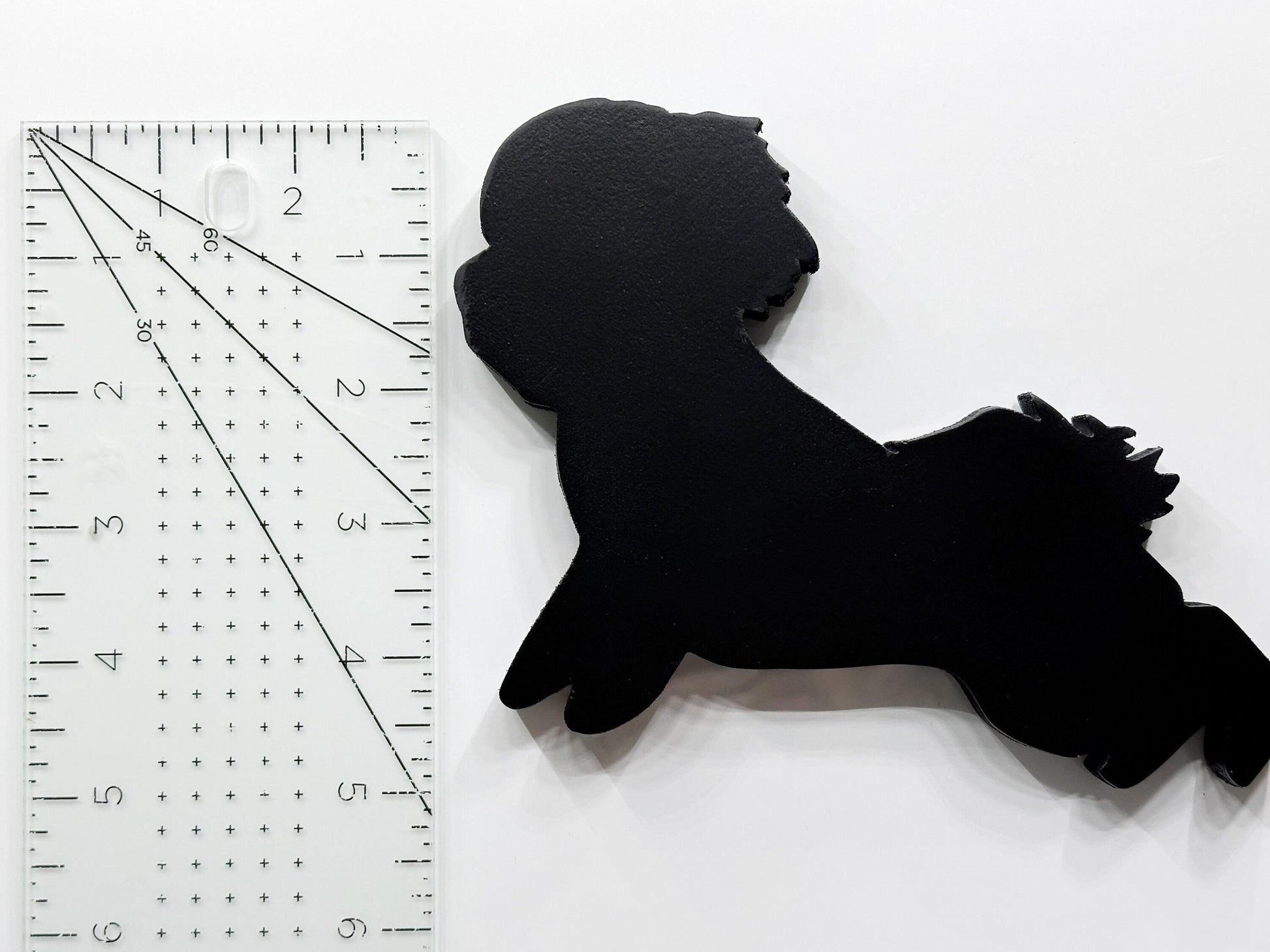 This little Shih Tzu seems to be begging for a treat… or maybe he’s running 🤔 Either way, he’s adorable! This dog is hand scrolled from 1/2” wood and can rest on top of your door frame, if you position it down on all fours. If you position it upright, it can rest against something as in the main photo. It measures approximately 5” x 6”. It does not need to be attached to the wall, so your wall will be free of nail holes. Great for those rentals! Although you might want to secure them if you have children who like to slam doors 😉 You might also want to put it on a shelf. It is a small enough size to fit just about anywhere you’d like! It is painted on both sides so you can face it in either direction. Note: Not a toy and not for the outdoors