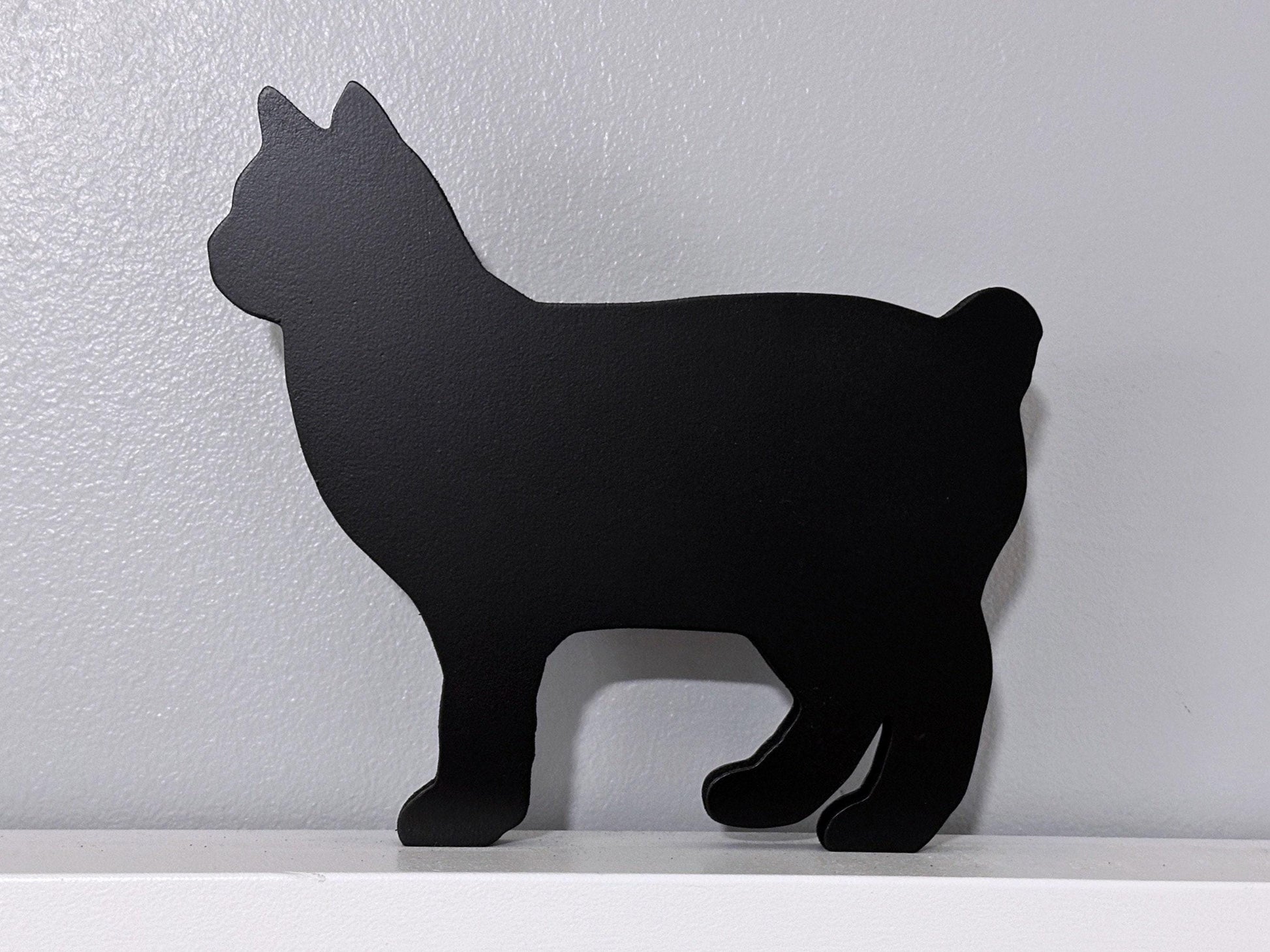 This Bobtail black cat silhouette door topper is a beautiful and unique piece of home decor that is sure to add a special touch to any room. Each piece is carefully crafted. It is cut and sanded to create a smooth base, then carefully painted for a polished finish. It is painted on both sides so you can face it either left or right.